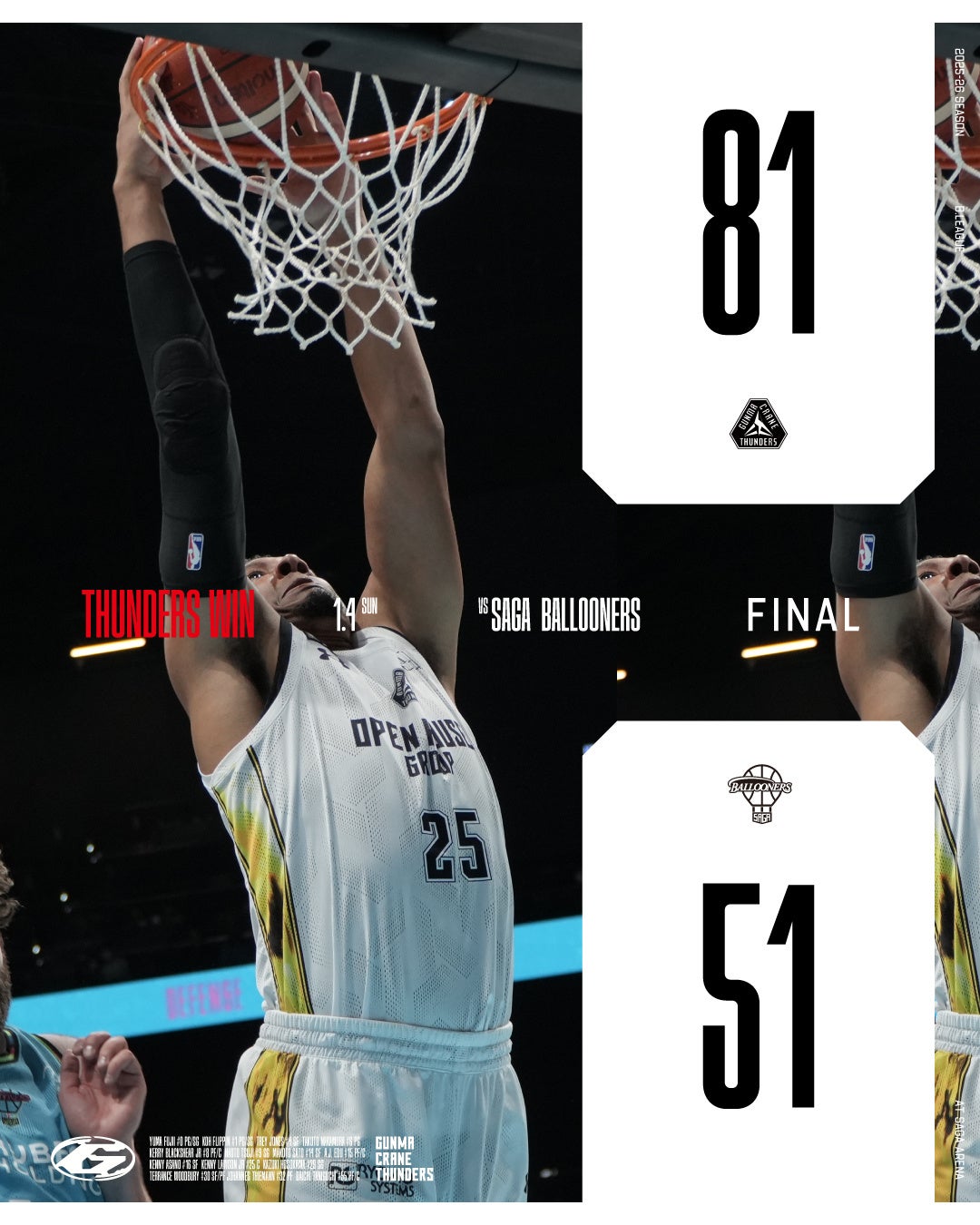 【群馬クレインサンダーズ:試合結果】1/4(日) vs 佐賀バルーナーズ りそなグループ B.LEAGUE 2025-26シーズン