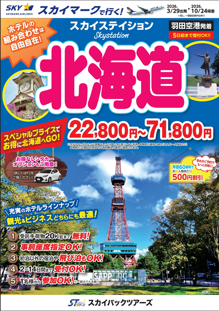 スカイパックツアーズ株式会社(本社:東京都中央区、社長:横山正巳)は、スカイマークを利用した価格固定型のパンフレット旅行商品「スカイステイション 北海道」【羽田空港発着】(2026年3月29日出発~2026年10月24日帰着)の販売を開始します。スカイマークだけを取り扱う専売店だからできるスペシャルプライス!早めのご予約がお得です。また、オンライン専用のスカイマーク公式ダイナミックパッケージ『たす旅』ではクーポンセール 実施中♪8月から10月の予約が特にお得! スカイマークでグルメと大自然を満喫する旅へ♪ 「スカイステイション 北海道」 スカイマークを利用して羽田空港から北海道へ。北海道中のおいしい食材が集まる札幌はジンギスカン、スープカレー、海鮮丼、お寿司など北海道で是非とも食べたいと思うグルメのお店がいっぱい。小樽や登別温泉、洞爺湖温泉と組み合わせて旅行を計画するのもおすすめ!レンタカーオプションを申し込んで、富良野や旭川へのドライブもgood♪お好みのホテルなどを自由に組み合わせることができる『スカイステイション 北海道』に北海道旅行はお任せください。 【デジタルパンフレット】 https://www.skypaktours.co.jp/individual/pamphlet_20260329/