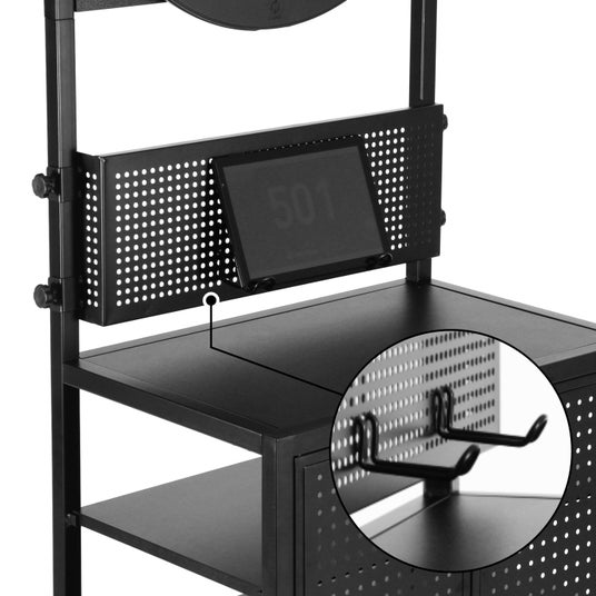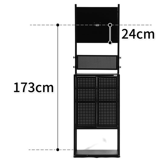 ●「目隠し」機能で生活感を排除:スタイリッシュなメタルフレームに、磁石対応のメタルパンチングパネル&収納扉が付属。生活感のある日用品やごちゃつく配線を目隠しして、スッキリ美しく整えられます。