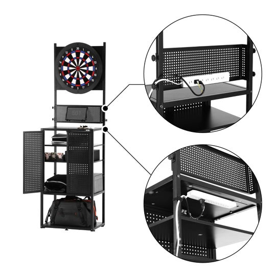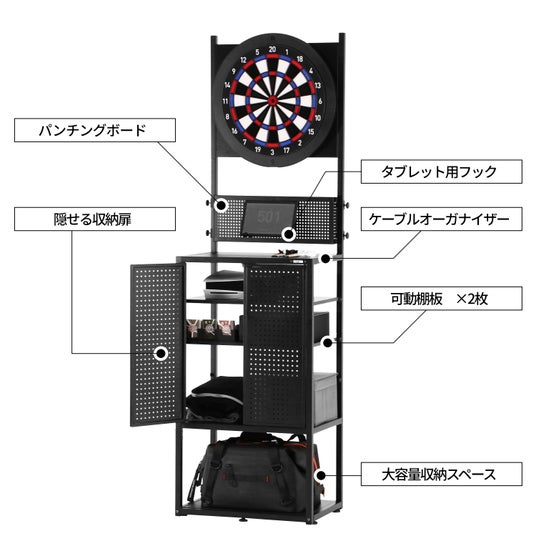 ●収納一体型ダーツスタンド:土台部分に、大容量の目隠し扉付きラックを搭載。空間を有効活用しながら、快適さとオシャレさを両立した「理想のダーツ部屋」を構築できます。