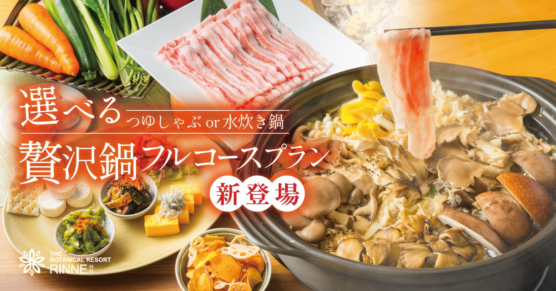 日本初の“泊まれる植物園”※「THE BOTANICAL RESORT 林音(ザ ボタニカルリゾート リンネ)、以下:林音(リンネ)」は、2026年2月1日(日)~4月30日(木)限定で、茨城のブランド豚「常陸の輝き」・ブランド鶏「つくば鶏」と、地元農園七会(ななかい)きのこセンターのきのこをふんだんに使用した、つゆしゃぶor水炊き鍋が選べる贅沢鍋フルコースプランの予約を開始いたしました。本プランは宿泊するコテージやグランピングに備わる暖房完備のプライベートデッキで、鍋をはじめとするフルコースを楽しめるプランです。 ※「日本初の“泊まれる植物園”」については、株式会社ボタラシアンリゾートにおいて、2025 年 9 月時点で自社調査(インターネット検索・各種データベース確認、ChatGPT による補助調査を含む)を行った結果、日本国内において同様の施設形態は確認されなかったことに基づき表現しています。
