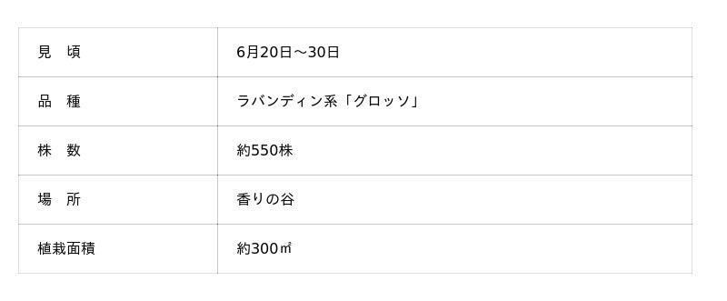 香りの谷は、砂丘ガーデンの谷間を利用した場所で、上から眺めても楽しめる沈床花壇式のハーブガーデンです。この場所は傾斜地で樹木が周囲を囲んでおり、風の動きを弱めるのでハーブガーデンに適した環境となっています。約2,200平方メートル の敷地内では、ラベンダーのほかにも、カレーのような香りをもつ「カレープラント」や、葉を揉むとコーラのような香りが広がる「コーラプラント」、免疫力を高めるとされる「エキナセア」などを、お楽しみいただけます。