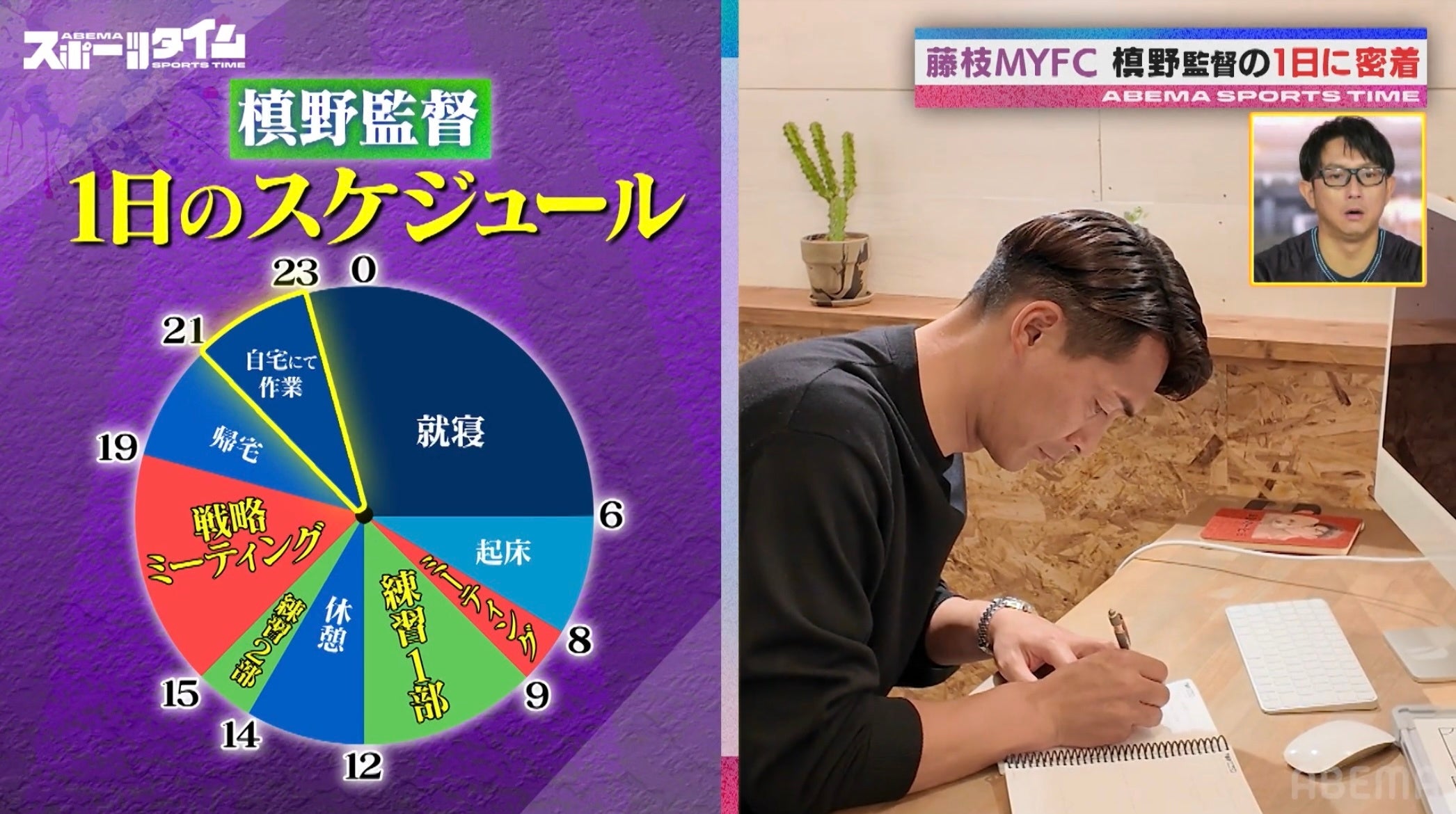 密着はクラブハウスのスタッフルームからスタート。槙野監督は「基本的に、朝8時くらいにクラブハウスに行って夜7時まではいる。クラブハウスに12時間くらいいますね」と語り、朝のミーティングから午前・午後2部練習、試合に向けたミーティング、自宅での作業まで、まさにサッカー漬けの1日を公開します。