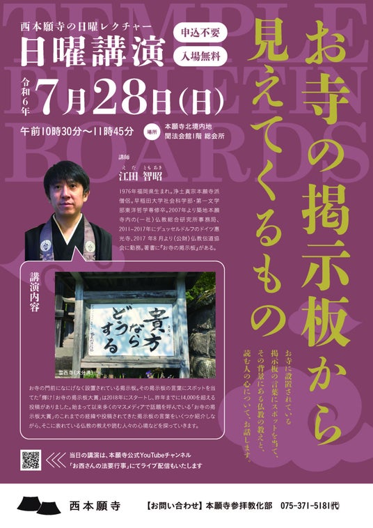 【西本願寺】日曜講演 7月開催のお知らせ「第4回 お寺の掲示板から見えてくるもの」《申込不要・入場無料》