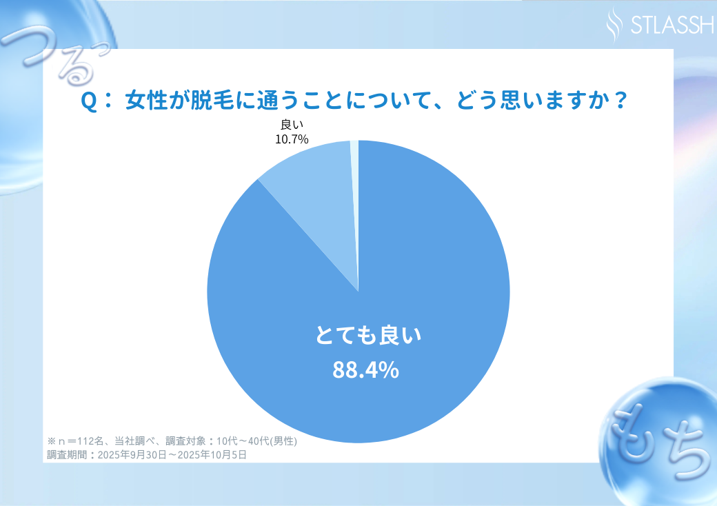 株式会社クリア(本社:東京都渋谷区、代表取締役社長:勝沼 潤)が運営する女性脱毛サロンストラッシュは、10代~40代の男性112名を対象に「『女性の脱毛』に関するアンケート調査」を実施。その結果、約99.1%*¹の男性が『女性の脱毛』に好意的であることが分かりました。