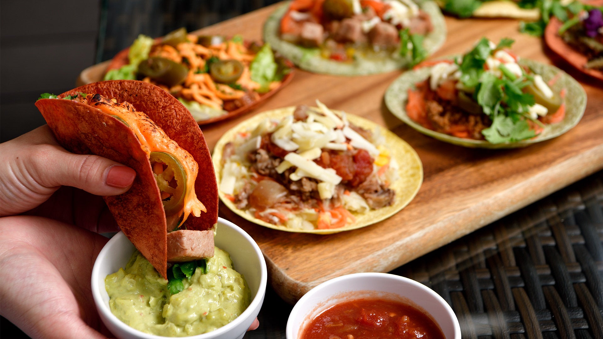 “選ぶ楽しさ”と“体験価値”の向上をコンセプトに、主食材5種、トッピング10種、ソース5種、トルティーヤ3種の計23種類をご用意。ジューシーなミートや爽やかな野菜、濃厚なソースを自由に組み合わせ、オリジナルのタコスをお楽しみいただけます。
