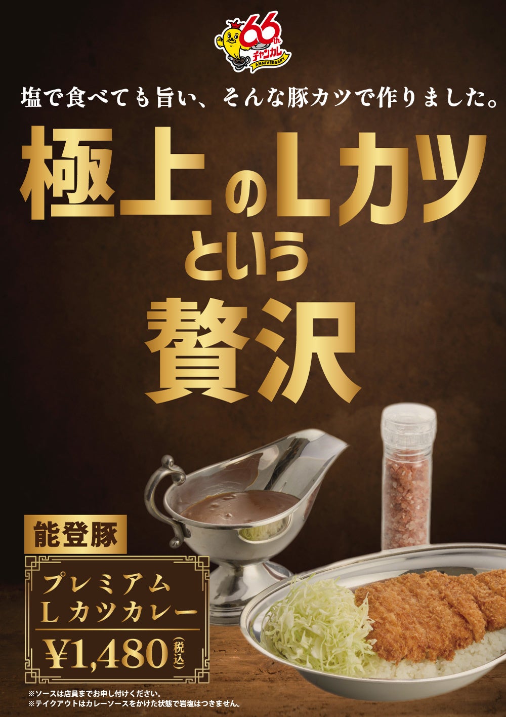 株式会社チャンピオンカレー(本社:石川県野々市市、代表取締役社長:南 恵太)は、創業66周年へ向けた感謝企画「66(ロクロク)企画」の一環として、看板メニュー「Lカツカレー」を進化させた「プレミアムLカツカレー」を、2026年4月6日(月)から6月5日(金)までの期間限定で販売いたします。