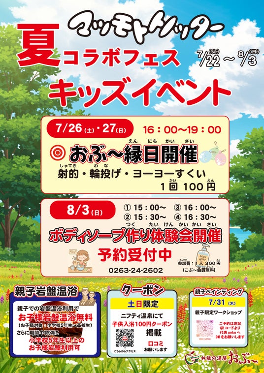 予約不要・無料で参加できます。 開催時間は当日Instagramをチェック! ●キッズイベント ●おぶ~縁日開催