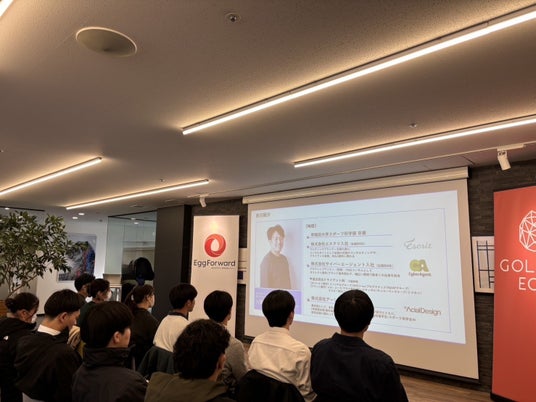 ●企業のプレゼンテーションオープニングに続いて、イベントでは面談を予定している4社の企業が、それぞれ学生に向けてプレゼンテーションを行いました。各企業は、自社が大切にしている想いや仕事の内容、社内の雰囲気について説明し、参加者は真剣な眼差しで話に耳を傾けていました。