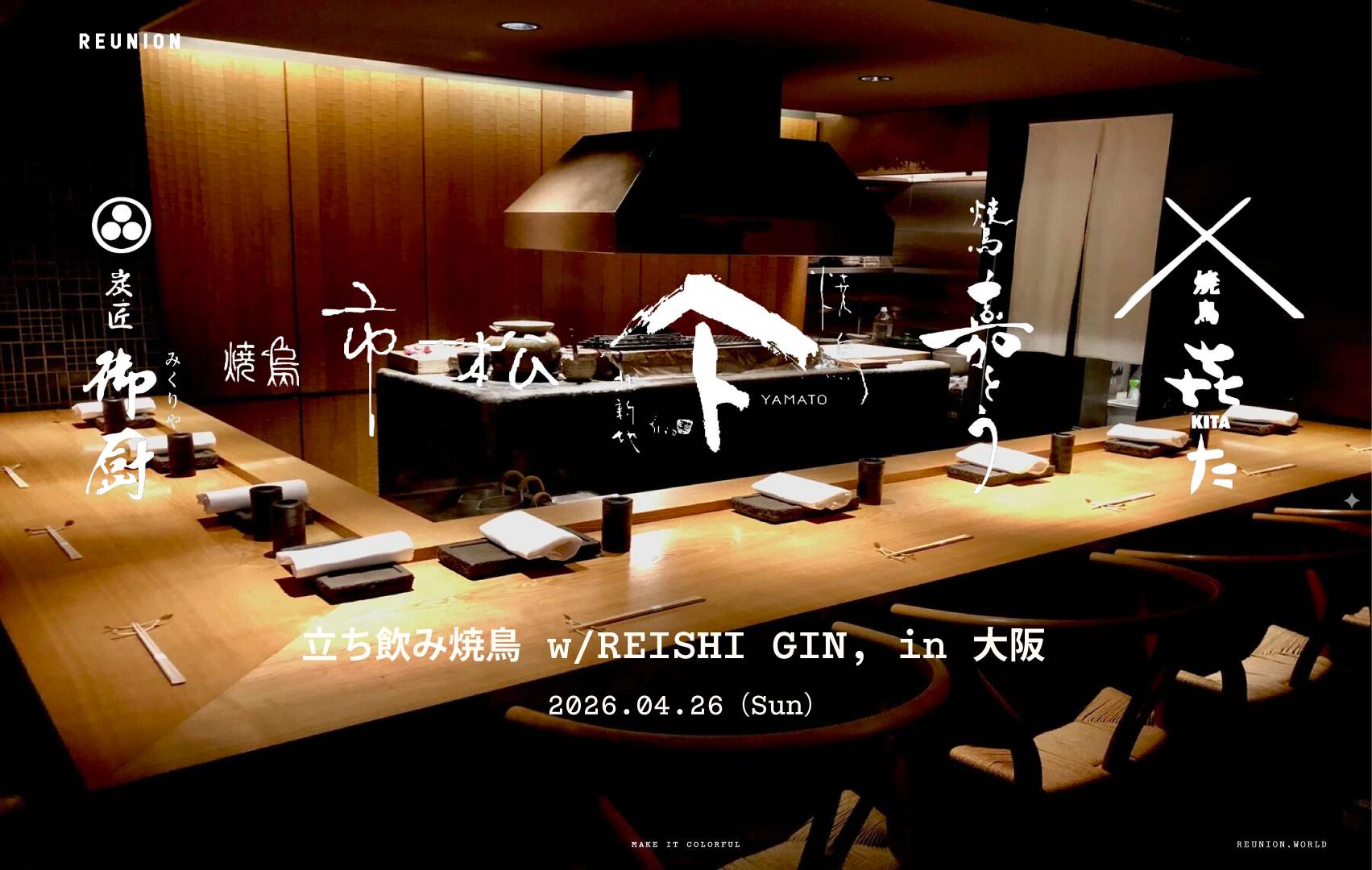 地球と人にやさしいウェルネスブランドREUNION(株式会社WWWE、東京都渋谷区)が展開する食中酒のニュースタンダード「REISHI GIN,」は、2026年4月22日(水)のアースデイ(地球の日)に3周年を迎えます。4年目となる今年は、昨年多くの来場者を集めた、名店の焼鳥を一度にカジュアルに楽しめる立ち飲みスタイルのPOPUPイベント「立ち飲み焼鳥 w/REISHI GIN,」を全国へ展開。全国各地を代表する焼鳥店とともに、地域ごとの焼鳥の魅力を発信しながら、珠玉の焼鳥とREISHI GIN,のペアリングを堪能できる唯一無二の焼鳥体験を提供します。今年最初の開催となる第三弾は、2026年4月26日(日)に関西初となる大阪での開催が決定。大阪の炭匠 御厨、焼鳥 市松、焼鳥YAMATOに加え、東京から焼鳥 嘉とう、焼鳥 喜た(KITA)が参加し、ミシュランガイド掲載店を含む名店5店舗が集結します。 立ち飲み焼鳥 w/ REISHI GIN,とは? 各地を代表する焼鳥店3~5店舗が一つの会場に集い、1日限定で、各店の珠玉の焼鳥とREISHI GIN,のペアリングを堪能できる立ち飲みスタイルの焼鳥イベントです。立ち飲みというカジュアルな形式で、複数の名店の味を”ハシゴするように”楽しめる、1日限りの特別な焼鳥体験を提供します。昨年、東京で開催した2回のイベントでは多くの来場者を集め、今回は関西初となる大阪開催が決定。予約困難な焼鳥店が集結し、関西ならではの「焼鳥とスピリッツ」の新たな楽しみ方を提案します。また、本イベントでは、焼鳥文化の魅力を多くの人に伝えるとともに、焼鳥、そしてREISHI GIN,に欠かせない山椒の未来を見据え、売上の一部を山椒農家への寄付に充てる取り組みも行います。 焼鳥とREISHI GIN,の相性 REISHI GIN,のキーボタニカルである「霊芝(REISHI)」には、グルタミン酸・グアニル酸といったキノコ由来の旨み成分が含まれており、これらが鶏肉の旨み成分(イノシン酸)と重なり合うことで、三大旨味成分の相乗効果により、味わいに奥行きが生まれます。さらに、山椒のスパイシーな風味が脂をリセットし、一味などの香辛料や甘いタレとも相性よく、焼鳥の美味しさを一層引き立てます。 今後は東京・大阪から全国へと展開を広げ、日本が誇る食文化である焼鳥と、日本の食中酒に彩りを加えるREISHI GIN,とのペアリング体験を通じて、焼鳥文化の魅力をより多くの人へ届けるとともに、食中酒の新たなスタンダードを提案していきます。また本イベントでは焼鳥やスピリッツを支える素材や生産者にも目を向け、その価値を持続可能なかたちで次世代へとつなぐ取り組みを進めてまいります。 「立ち飲み焼鳥 w/ REISHI GIN, in 大阪」