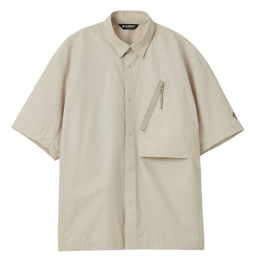 高強力糸を織り込んだリップ生地採用の半袖シャツ。左胸のファスナーポケットで収納力を強化し、ロゴ入りスナップ釦でフロント開閉が可能に。脇下のガゼットパターン設計により動きやすく、撥水機能で雨にも対応。アウトドアから日常までシーンレスに活躍する一着です。