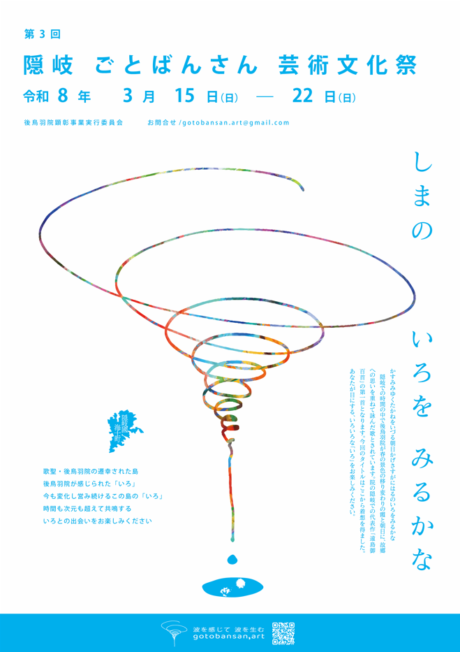 後鳥羽院顕彰事業実行委員会(委員長:大江和彦海士町長)では、令和8年3月15日(日)~22日(日)にわたり、「第3回 隠岐ごとばんさん芸術文化祭」を開催します。 実行委員会では、後鳥羽院遷幸800年を引き継ぐ活動として、「ごとばんさん(後鳥羽院)」に代表される海士町の文化を未来に伝えるために、新たな形で生み出し、伝えていく「ごとばんさん芸術文化祭」を令和5年度より始動いたしました。第3回目となる今回は「隠岐ごとばんさん芸術文化祭」とタイトルを改め、下記の通り開催いたします。 詳細を見る「ごとばんさん」をテーマに、全体コンセプトは「波を感じて、波を生む」