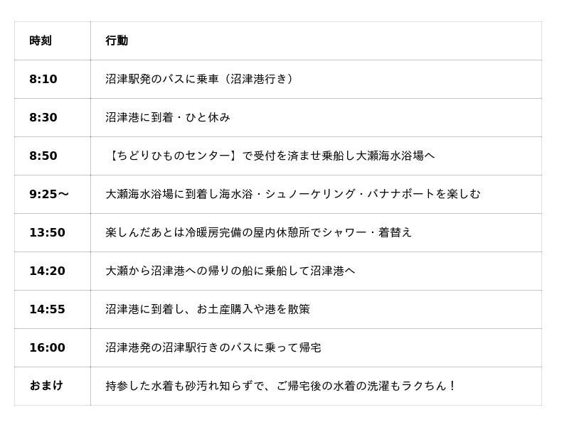 6.そのまま帰宅、またはホテルでゆっくり【沼津港~大瀬海水浴場 夏季定期便 時刻表】