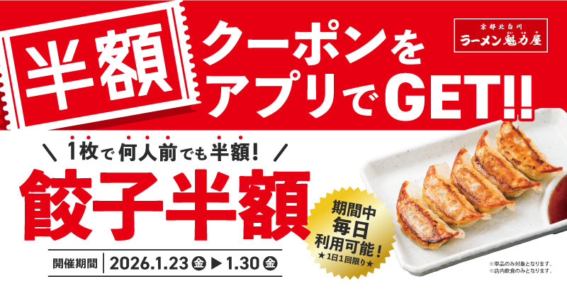 京都北白川ラーメン魁力屋をチェーン展開する株式会社魁力屋(https://corp.kairikiya.co.jp/ 本社:京都市中京区、代表取締役社長:藤田 宗、以下魁力屋)は、「餃子半額キャンペーン」を2026年1月23日(金)~1月30日(金)の期間で開催いたします。 餃子、何皿いく?アプリ会員なら何人前でも半額に! 1月23日(金)~1月30日(金)の8日間限定で、「餃子半額キャンペーン」を開催!