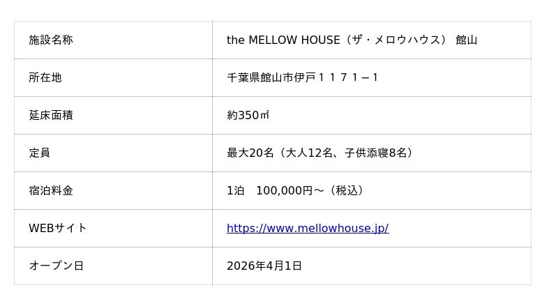 株式会社エイトは、2026年4月1日より、オーシャンフロントの一棟貸しヴィラ「the MELLOW HOUSE 館山」(旧:GIFTHOUSE館山伊戸)をリニューアルオープンいたしました。