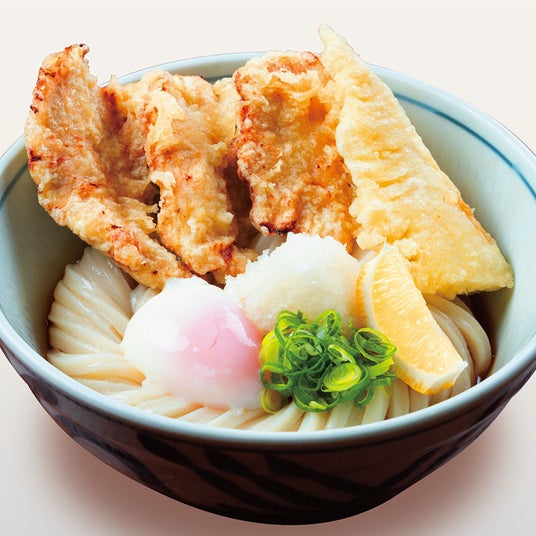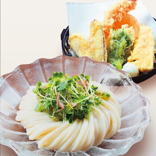 讃岐うどんならではの腰とのど越しを存分にご堪能頂けるぶっかけうどんに海老天、半熟卵天など人気の天ぷらをトッピングしたメニューです。