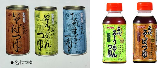 <1973年発売当時の「名代つゆ」シリーズ> <2024年リニューアルした「名代そうめんつゆ・そばつゆ」200ml>