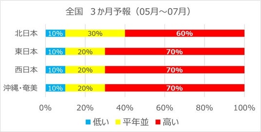 4月21日に更新された3か月予報では5-7月の平均気温は北日本で平年よりも高い確率が60%、東・西日本・沖縄・奄美ではなんと70%と予報されています。