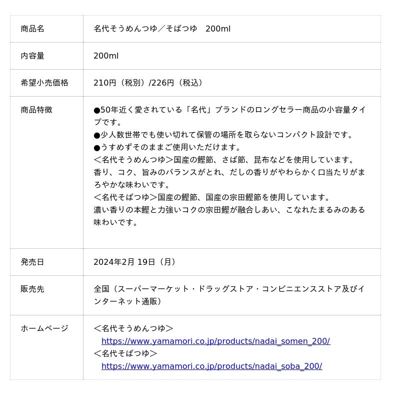 ヤマモリは1889年(明治22年)に醤油醸造で祖業、現在は調味料やレトルト、飲料など幅広い商品を持つ総合食品メーカーです。名代つゆは1973年、日本で最初のストレートつゆとして誕生しました。特に近畿エリアを中心にご愛顧いただき、手軽な缶の設計で夏の風物詩として食卓を彩ってきました。