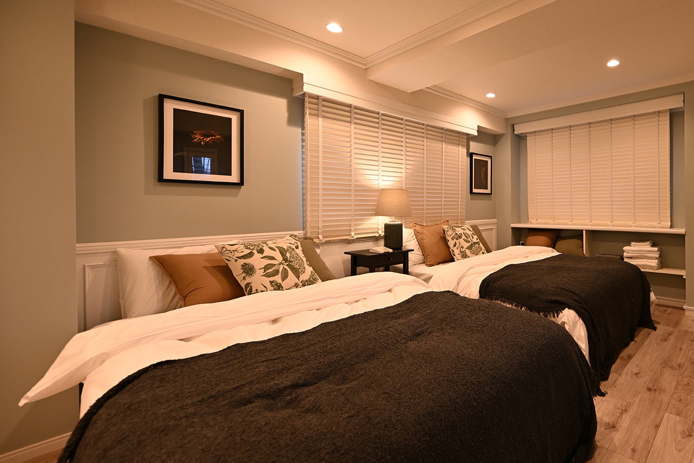 セージグリーンの壁紙と、クラシカルな印象の腰壁が印象的な内装。■ 「暮らすように、贅沢に泊まる」充実の設備