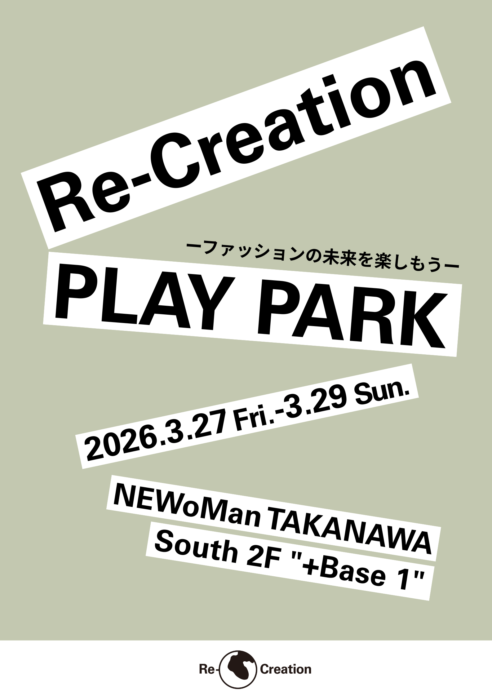一般社団法人Re-Creationは、2026年3月27日(金)から29日(日)までの3日間、ニュウマン高輪にて初の販売イベント**「Re-Creation PLAY PARK ―ファッションの未来を、楽しもう―」**を開催いたします。