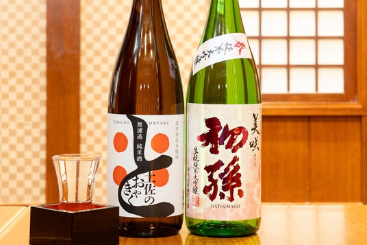 春に飲んでほしい日本酒2種類を厳選 この時期の味覚に合うオススメの酒として、山形県・東北銘醸「初孫 美咲 生酛純米大吟醸」(一合950円)と、高知県・土佐鶴酒造「土佐鶴 無濾過純米酒 土佐のおきゃく」(一合800円)の2種を、3月に引き続き提供します。