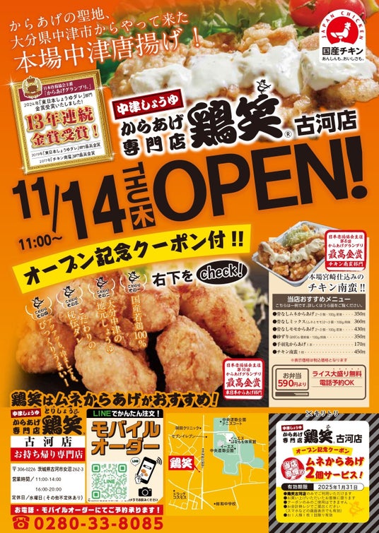 【鶏笑】からあげ専門店「鶏笑(とりしょう)古河店」11月14日(木)オープン!「ムネからあげ2個」がもらえるお得なキャンペーン実施!