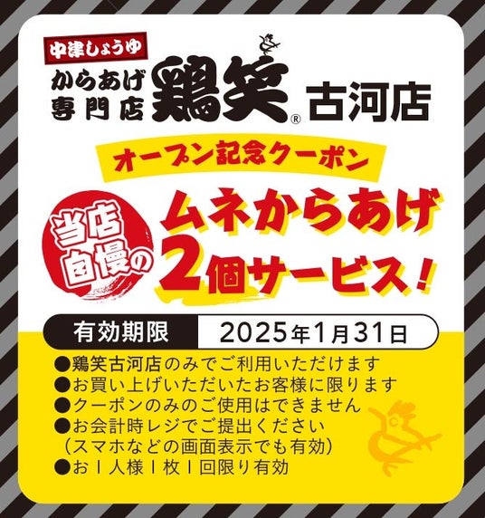 鶏笑 古河店のオープンを記念して、古河店限定で「ムネからあげ2 個」がもらえるクーポン券を、数量限定で店頭などでお配りしています。以下のクーポン画像をスマートフォン等でご提示いただいても有効です。皆様のご来店をお待ちしております!