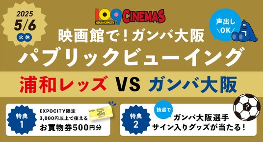 明治安田J1リーグ第15節 浦和レッズ戦のパブリックビューイングを109シネマズ大阪エキスポシティで開催いたします。入場チケット1,000円(税込)をご購入いただくと、入場者全員にEXPOCITY限定3,000円以上で使えるお買物・お食事券500円分と、さらに抽選でガンバ大阪選手サイン入りグッズが当たります。劇場売店でご購入された飲食物は、上映中にお召し上がりいただけます。声出しもOKな迫力満点の映画館で、みんなでガンバ大阪へ声援を送りましょう! ◆日時・場所 2025年5月6日(火・祝) 109シネマズ大阪エキスポシティ シアター7(245席) ◆スケジュール 13:30 開場 14:00 キックオフ 16:00 試合終了(予定) ◆料金 一律1,000円(税込) ◆特典 ・EXPOCITY限定 3,000円(税込)以上でご使用いただけるお買物・お食事券500円分 ・抽選で、ガンバ大阪選手サイン入りグッズプレゼント(劇場内にてお渡しいたします。) サイン入り公式球×1名 選手のサイン寄せ書き サイン色紙×2名(一森選手、倉田選手 各1枚) サインシャツ×2名(宇佐美選手、中谷選手 各1枚) ◆販売スケジュール 4月22日(火)0:00より109シネマズ大阪エキスポシティ公式ホームページにて販売開始 109シネマズ大阪エキスポシティホームページ:https://109cinemas.net/osaka-expocity/ ◆お願い・注意事項 ・客席内には劇場売店で購入された飲食物に限りお持ち込みいただけます。 上記以外の飲食物の持ち込みは禁止いたします。 ・イベント運営の妨げになる全ての行為、周囲のお客様に危害や迷惑のかかる 全ての行為を禁止いたします。 ・応援グッズのご使用は、周りのお客様の視界を遮らないようご配慮いただくようお願いいたします。 また、太鼓・ブブゼラ等の過度な音量の応援グッズはご遠慮ください。 ・シネマズポイント付与は対象外となります。 ・チケットご購入の特典のお渡しは、当日ご参加いただいた方に限ります。109シネマズとは