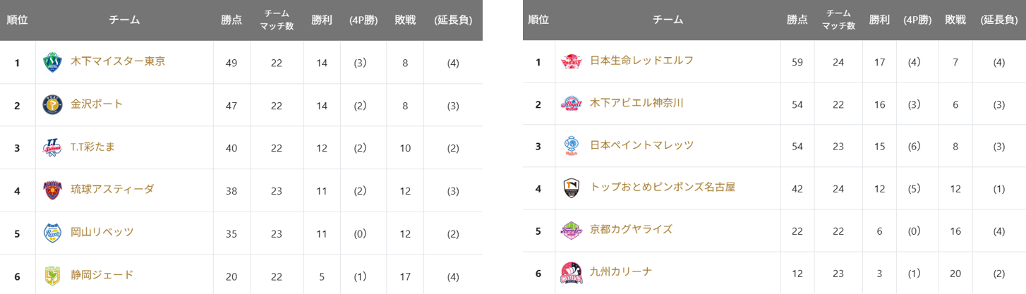 日本生命レッドエルフ 3-1 木下アビエル神奈川 岡山はホームで2連敗、涙を流す場面も 岡山は土曜日に静岡と対戦。岡山のハオシュアイ/及川瑞基ペアは、ストップを駆使したプレーで静岡ペアを崩し勝利。岡山が先行するも、第2マッチは両ハンドのパワフルプレーを貫いた静岡・阿部悠人がハオを破る。第3マッチは韓国のベテラン、イサンスが勝利し、岡山が勝利に王手。第4マッチも英田理志が2ゲーム先取し、勝利を目前とする岡山。しかしここから静岡が逆襲。濱田一輝が英田のエースボールに対して粘りきり逆転勝利。VMも勢いそのままに阿部がイサンスを破り静岡が勝利した。 日曜にはKM東京と対戦。岡山は昨日同様、ハオ/及川ペアを起用。木下の若々しい大学生ペアに対し、”技”を見せた岡山ペアが接戦を制する。第2マッチは岡山・ハオvs木下・吉村和弘のマッチアップ。両ハンドのパワープレーという持ち味を存分に活かした吉村が3-0のストレート勝利で試合をイーブンに戻す。第3マッチで岡山に昨シーズンまで所属していたKM東京・吉山僚一が勝利すると、第4マッチはKM東京・川上流星も得意のサービスで終始流れを相手に渡さずストレート勝利。3-1でKM東京が勝利。ホーム最終戦だった岡山は試合後、セレモニーを行ったが、涙を流す選手の姿も見られた。 この結果により、土曜日には金沢ポートが、日曜には木下マイスター東京がプレーオフ進出(レギュラーシーズン3位以内)を決めた。 トップはラストホームマッチで2連勝 土曜日には京都と対戦。トップはダブルスに出澤杏佳/永尾尭子ペアをシーズン初めての起用。永尾のドライブと出澤のスマッシュが炸裂し、2-0で勝利。第2マッチのトップ・小塩悠菜vs京都・松島美空のマッチアップは、各ゲーム競り合うも、要所でスマッシュを炸裂させた小塩が勝利。第3、第4マッチもトップが勝利し、4-0でトップが勝利した。 日曜は九州と対戦。第1マッチのダブルスでは、九州の栗山優菜/山室早矢ペアが3-11の第1ゲームから逆転勝利を収め、笑顔を見せた。しかし続く第2、第3マッチをトップ・木村香純、小塩悠菜が連取し逆転。第4マッチは昨シーズンまで九州に所属していた出澤杏佳がカットマンの山室早矢に対して、フォア面の表ソフトラバーを活かしたスマッシュで対抗しストレート勝利。トップが3-1で勝利し、ホーム最終戦を勝ち星で飾った。 日本生命は北の大地で上位対決を連勝 北ガスアリーナ札幌46で行われた日本生命のホーム戦は女子の上位対決となった。 日曜日はニッペMと対戦。第1マッチのダブルスで、日本生命は上澤杏音/笹尾明日香ペアを起用。カット×攻撃の佐藤瞳/芝田沙季ペアに対して、フォアハンド攻撃で攻めきり勝利。第2マッチは日本生命・赤江夏星vsニッペM・横井咲桜の同学年対戦を横井が制し、試合はタイに。第3マッチは日本生命・笹尾明日香がシングルスとダブルスの2点取り、第4マッチはニッペM・佐藤瞳が地元北海道での勝利を飾り勝負はビクトリーマッチへ。第2マッチの再戦となった一戦は2-7で横井がリードする展開。しかし、「早田さんがいない時は自分がエース」と語る赤江はここから脅威の9連続得点で逆転勝利を収め、チームを勝利に導いた。 翌月曜日は、KA神奈川と対戦。第1マッチのダブルスはレシーブで上手くチャンスメイク出来た日本生命の上澤/笹尾ペアが連日の勝利。第2マッチには今シーズン、KA神奈川から移籍した日本生命・面手凜が登場。先日行われた世界選手権の代表選考会で優勝した面手だったが、百戦錬磨のKA神奈川・平野美宇が立ちはだかった。下回転からの展開で試合を支配した平野が勝利し、マッチカウントを1-1とする。第3マッチは昨日ビクトリーマッチで勝利した赤江夏星が登場。ビクトリーマッチで前回敗れている、チャンルイにストレート勝利でリベンジ。第4マッチも笹尾明日香が勝利し、3-1で日本生命が勝利。上位対決を連勝で終えた。