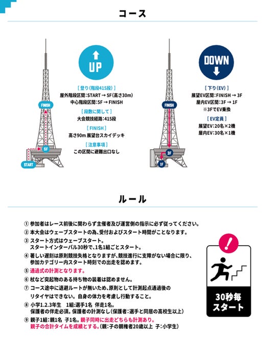 当日は展望階を目指し、小学校低学年から70代の方までの約500名の参加者が屋外階段(415段)を駆け上がります!また、国内最高峰サーキットレース「ステアクライミングジャパンサーキット」に参加する選手たちが、ハイレベルな戦いを繰り広げます。