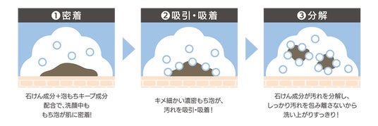 従来の泡洗顔*1の約3倍となる石けん成分を高配合*1することで、これまでにない*1泡もちの良さ、泡弾力、洗い上がりのすっきり感を実現しました!弾力のあるキメ細かい濃密もち泡が肌に密着、汚れを吸引・吸着して、肌悩みの原因となる皮脂や古い角質をしっかりオフ。うるおうのにすっきりとした洗い上がりです。