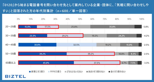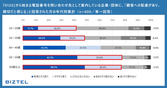これを年代別に見ると、「気軽に問い合わせやすい」「顧客配慮があると感じる」の問いに「非常にそう思う」「ややそう思う」と回答した割合は、20代~30代では30~50%台に留まりました。一方、50~60代以上ではいずれも8割に迫る結果となり、年齢層が上がるほど0120番号に対する肯定的な評価が顕著に表れました。