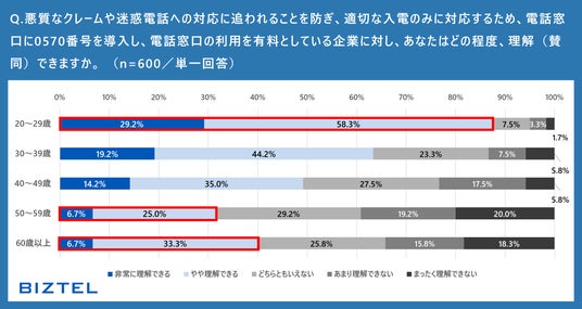 しかし、0570番号の採用背景に対する理解度を年代別に見ると、20代では約9割が「理解できる」と回答している一方で、50~60代以上では「理解できる」と回答した割合が相対的に低い結果となりました。