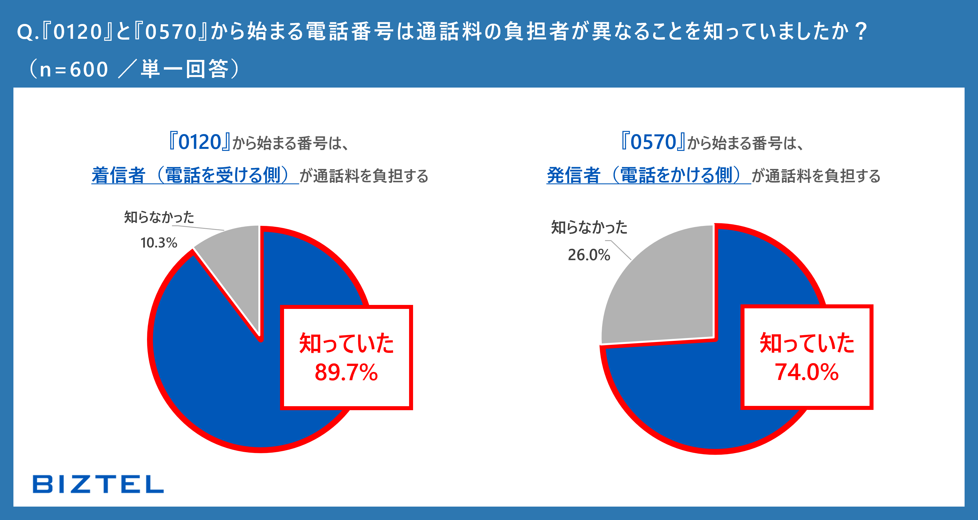 0120・0570それぞれの「番号が持つ意味」の認知度を調査すると、0120番号では89.7%、0570番号では74.0%という結果になりました。いずれも7割超えと高い水準にあります。