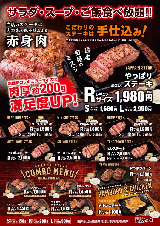 「やっぱりステーキ(ミスジステーキ)」「赤身ステーキ」「ロースステーキ」を実質的に値下げします。