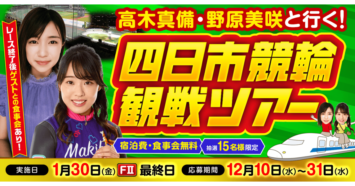 元競輪選手の高木真備さん、野原美咲さんをお迎えして、四日市競輪観戦ツアーを開催します。お二人にはレース終了後のお食事会にもご参加いただきます。当日はレース予想提供や参加者限定の「toreta+」が当たるミッションイベントも予定しており、盛りだくさんの内容でお送りいたします。貴重なこの機会をぜひお見逃しなく!
