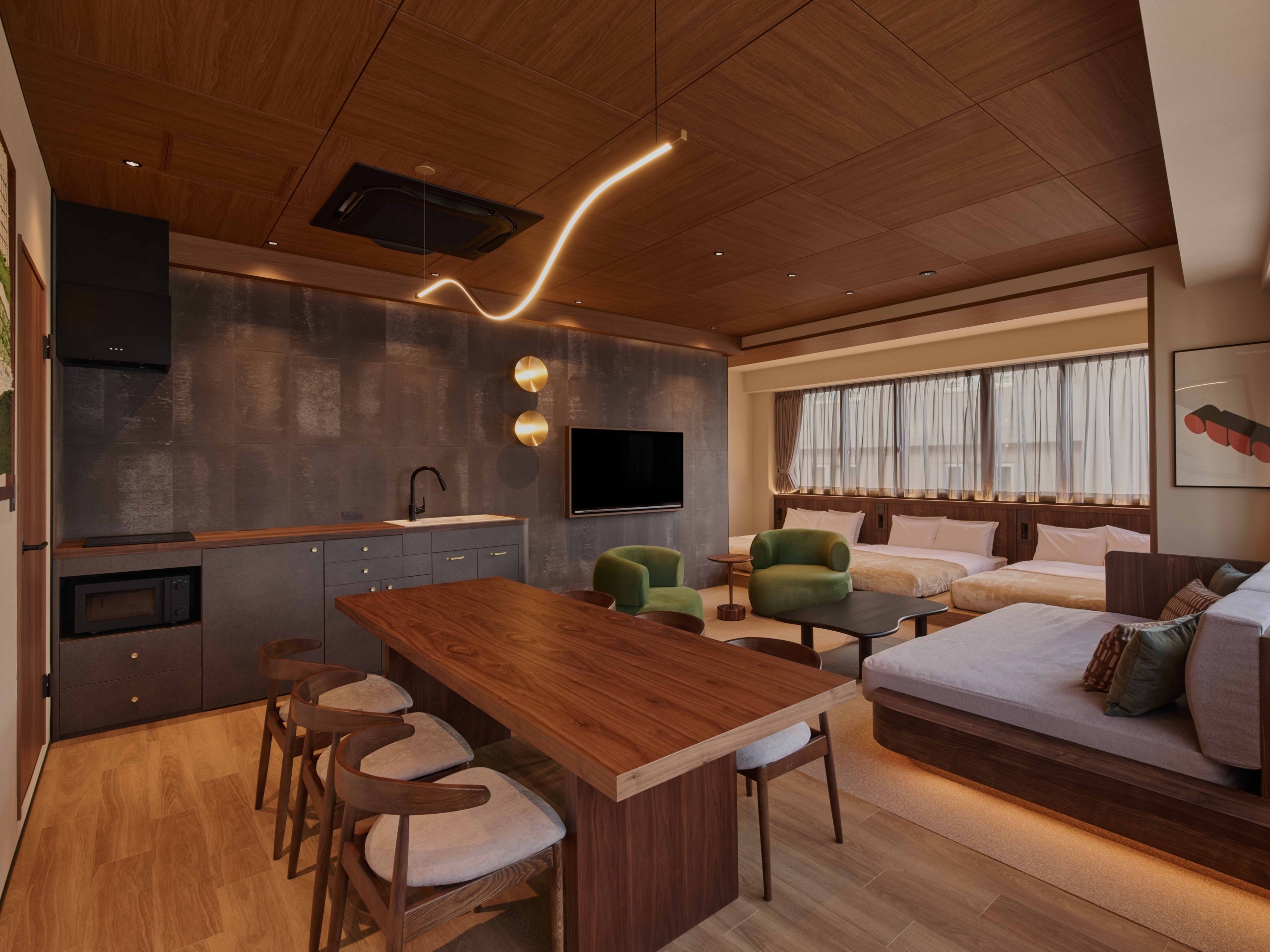 インバウンド需要の高い主要エリアに位置し、観光の拠点として利便性の高い立地を選定しています。全客室に、リビング・ダイニング・キッチン・洗濯乾燥機を備え、4名様以上での長期滞在にも適した空間設計を実現しています。無人運営でありながら、24時間サポート体制やシームレスなチェックイン・チェックアウト、ホテル基準の清掃クオリティを提供しています。そして、施設ごとに異なるコンセプトデザインが、旅先での滞在に特別感を添えます。