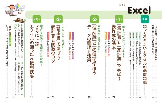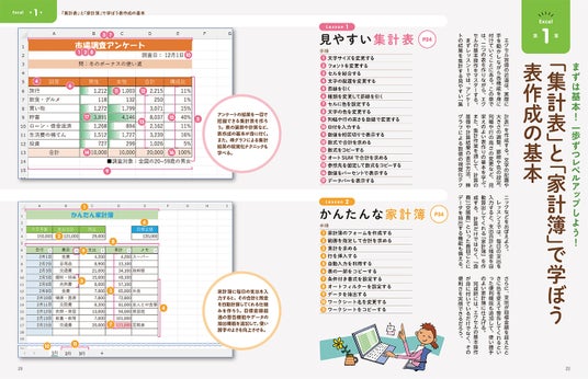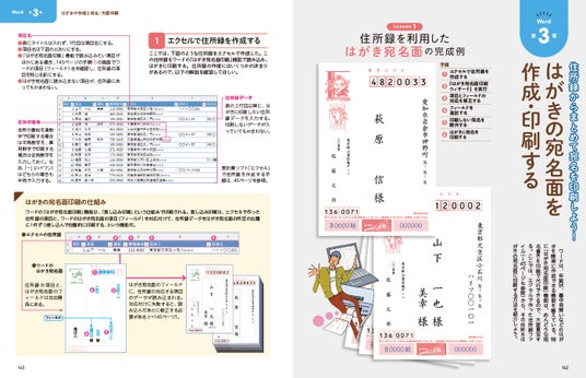 本書は、表計算ソフトのエクセル編と文書作成ソフトのワード編の2部構成になっています。まずは、Officeを代表するこれら両ソフトの使い方を基礎から解説。そうして基本的な操作方法を学んだあとに、エクセルであれば「集計表」「家計簿」「住所録」「請求書」、ワードであれば「案内状」「パンフレット」「チラシ」「はがき」といった実用的な文書の作り方を通じて、応用的な操作方法や機能を習得できる点が特徴です。