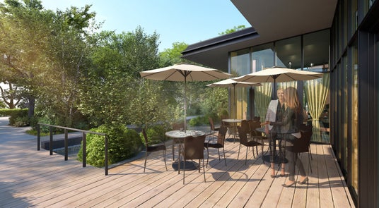 正面エントランスの左側に位置するもう片方のテラスには、可動式のオーニングが設けられており、天候が穏やかな日にはその心地よい雰囲気をお楽しみいただけます。