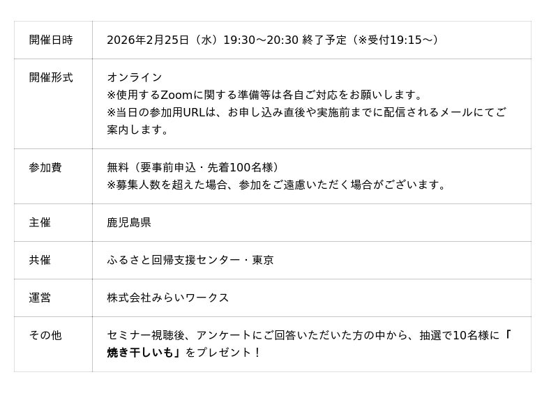 株式会社みらいワークス(本社:東京都港区、代表取締役社長 岡本 祥治)は、2026年2月25日(水)鹿児島県から受託した事業の一環で、オンライン移住セミナーを開催します。