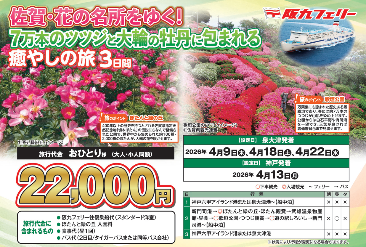 阪九フェリー・泉大津港または神戸六甲アイランド港発(北九州・新門司港行き)で 佐賀県「ぼたんと緑の丘」では牡丹、「歌垣公園」ではツツジ観賞をお楽しみいただける団体ツアーを販売しております。