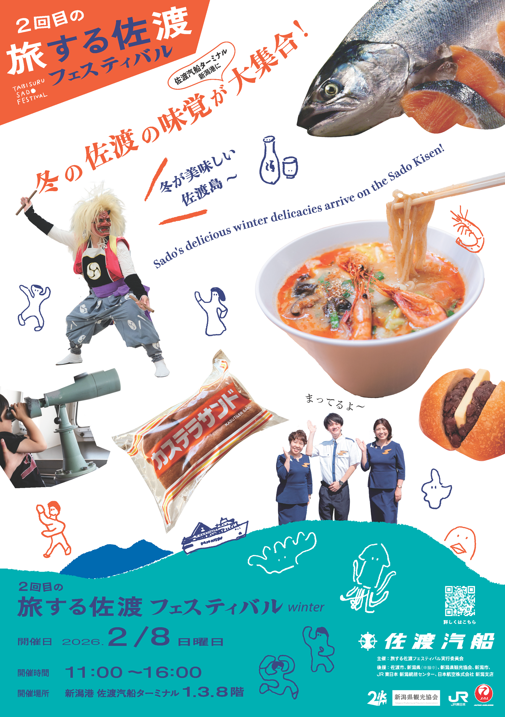 旅する佐渡フェスティバル実行委員会(事務局:佐渡汽船株式会社)は、佐渡島の魅力を新潟で体感できるイベント「旅する佐渡フェスティバルwinter」を、新潟港 佐渡汽船ターミナルにて開催いたします。 本イベントは、2025年6月に初めて実施したフェスティバルに続く、第2回目の開催です。今回のテーマは「冬の佐渡」。冬にこそ味わいたい佐渡の食や文化、体験を、新潟港で気軽にお楽しみいただけます。 冬の佐渡を味わう・見る・体験する1日 佐渡産食材を使った温かい料理や海の幸、地酒など、“冬の佐渡のおいしさ”が港に大集合。蒸し牡蠣や魚のすり身汁、日本酒の飲み比べなど、佐渡を旅する気分で食の楽しみが広がります。 普段は入れない場所で、特別な体験も 普段は立ち入れないターミナルの一部や停泊中の船内を、1日限定で特別解放。カーフェリー船内見学やお子さまを対象とした旅客係員おしごと体験など、港ならではのワクワクをぜひお楽しみください(有料・当日受付・先着順)。 屋根付き会場で、冬でも安心 会場は屋根付き・屋内中心(1Fを除く)のため、天候や寒さを気にせずお楽しみいただけます。家族連れから友人同士まで、冬のおでかけ先としてぜひお気軽にお越しください。 ■開催概要 開催日:2026年2月8日(日)※雨天決行 開催時間:11:00~16:00 開催場所:新潟港 佐渡汽船ターミナル(1階・3階・8階) 住所:〒950-0078 新潟県新潟市中央区万代島9番1号 入場料:無料(一部有料コンテンツあり) 主催:旅する佐渡フェスティバル実行委員会 特別協力:佐渡汽船株式会社 後援:佐渡市、新潟県(申請中)、新潟県観光協会、新潟市、JR東日本 新潟統括センター、日本航空株式会社 新潟支店 ※天候や船舶の運航状況により、プログラム内容や出店が変更・中止となる場合があります。 ※駐車場には限りがございます。公共交通機関のご利用をおすすめいたします。 ■イベント詳細・最新情報 佐渡汽船公式Instagram 「旅する佐渡 powered by 佐渡汽船」@sadokisen_official にて随時発信中!