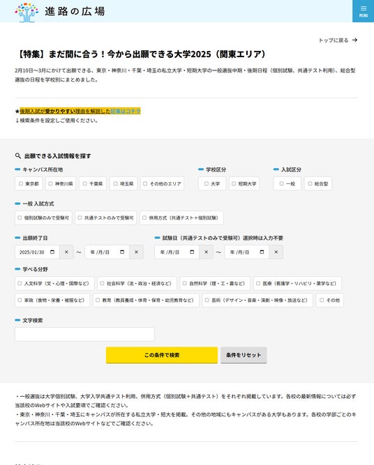 そこで私たち進路企画は、今年も大学受験を頑張る受験生や保護者に向けて、2~3月に出願できる首都圏の私立大学・短大の試験日程をまとめたページを自社WEBサイト「進路の広場」内に公開いたしました。https://hiroba.shinrokikaku.co.jp/later_exam/schoollist202501