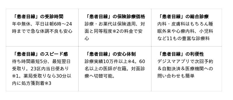 オンライン診療の特長:「患者目線のクリニック」のオンライン診療は、初診からのオンライン診療を提供し、11もの診療科をもつ総合診療クリニックです。私たちは「患者目線」を徹底し、平日早朝6時から24時まで・土日祝含む年中無休の幅広い診療時間、安心の保険診療価格、最短翌日にお薬が届くスピード感、そしてアプリ1つで完結する高い利便性を実現しました。都内に実院を構え、必要に応じて対面診療へもスムーズに切り替えられます。デジタルの速さと、対面診療の安心感を両立し、患者さまの健康を最短ルートで支えます。