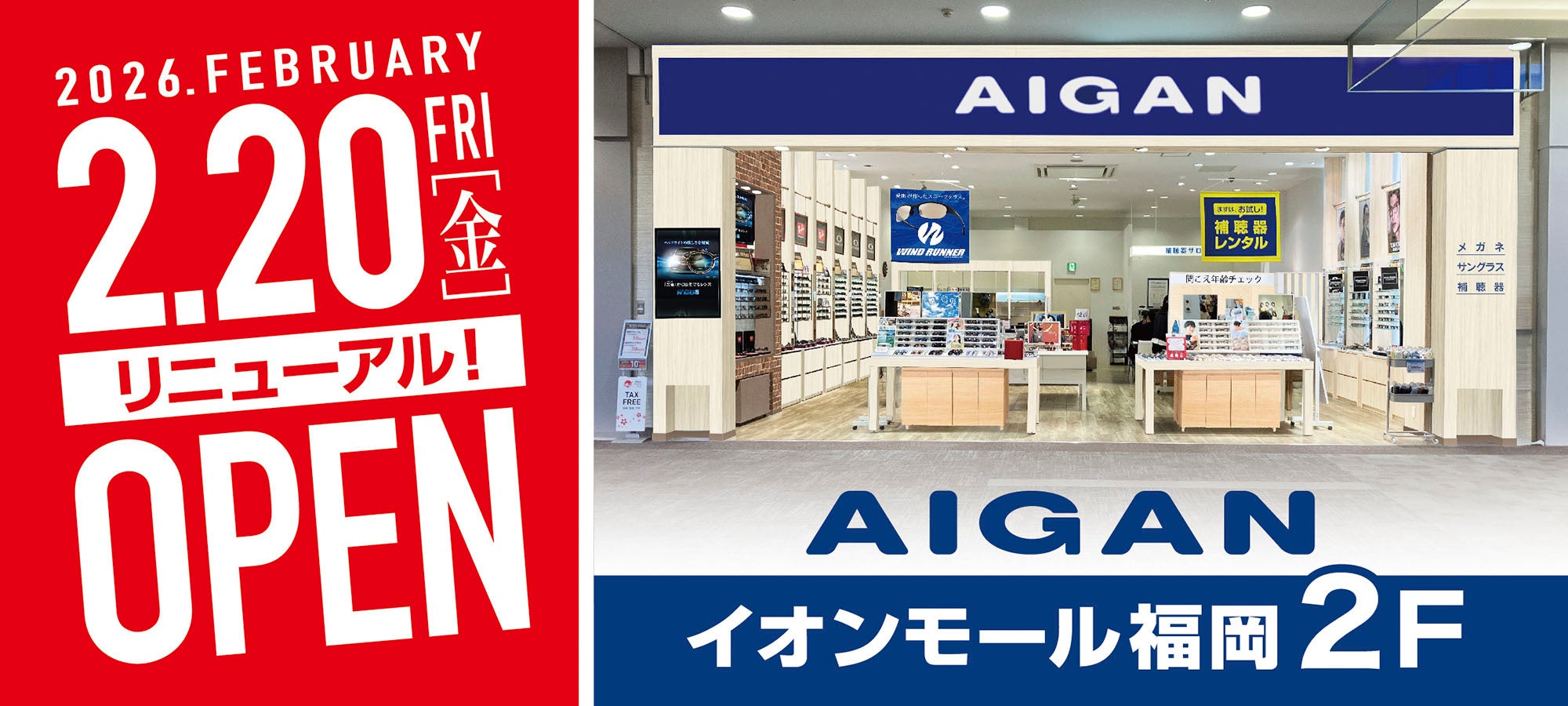 メガネ・補聴器を取り扱う「AIGAN」(https://www.aigan.co.jp/)を運営する愛眼株式会社(本社:大阪市天王寺区、代表取締役社長:佐々 昌俊)は、福岡県糟屋郡粕屋町のイオンモール福岡2Fに出店する「AIGAN イオンモール福岡店」を、2026年2月20日(金)にリニューアルオープンいたしました。