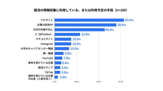就活情報の収集手段は「ナビサイト」(63.0%)、「企業の採用HP」(56.0%)、「大学の先輩や友人」(46.0%)の順となりました。また「X」(23.0%)や「クチコミサイト」「Instagram」(ともに15.0%)も一定の支持を獲得しています。企業主体で発信されるコンテンツだけでなく、自分と同じ立場(同級生や就活を経験した先輩)の人たちのクチコミも合わせて参考にしていると考えられます。