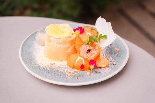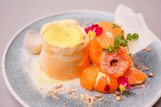 ふわふわ生地の中にクリームチーズのソースをたっぷり仕込んだ新食感のパンケーキの上には、みかんの皮のパウダーをトッピングし、爽やかさもプラスしました。