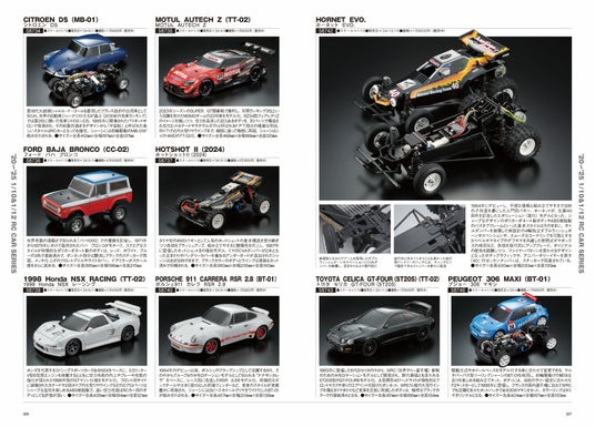 「ホーネットEVO.」を含む最新モデルまで完全収録 タミヤ初のRCモデルである1974年発売の「M4シャーマン」戦車や、世界初の電動RCカーである1976年発売の「ポルシェターボRSR934レーシング」を筆頭に、「ホーネットEVO.」を含む最新モデルまで収録。主力の電動カーモデルはもちろん、トラック、グライダー、ヨットなど過去に発売された1200を超えるRCモデルを解説しています。巻末にはRCカーキットをはじめスペアパーツや限定商品、輸出専用モデルまで網羅した完全保存版リストを掲載。