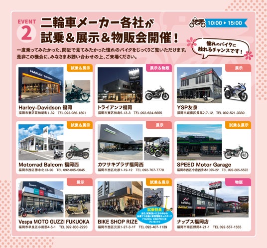 本イベントは、二輪車メーカー各社による最新モデルのバイク試乗会、展示会、そして物販会を実施いたします。普段なかなか触れることのできない憧れのバイクに跨り、姪浜ドライビングスクールのコース内でお好きなバイクを試乗しませんか?